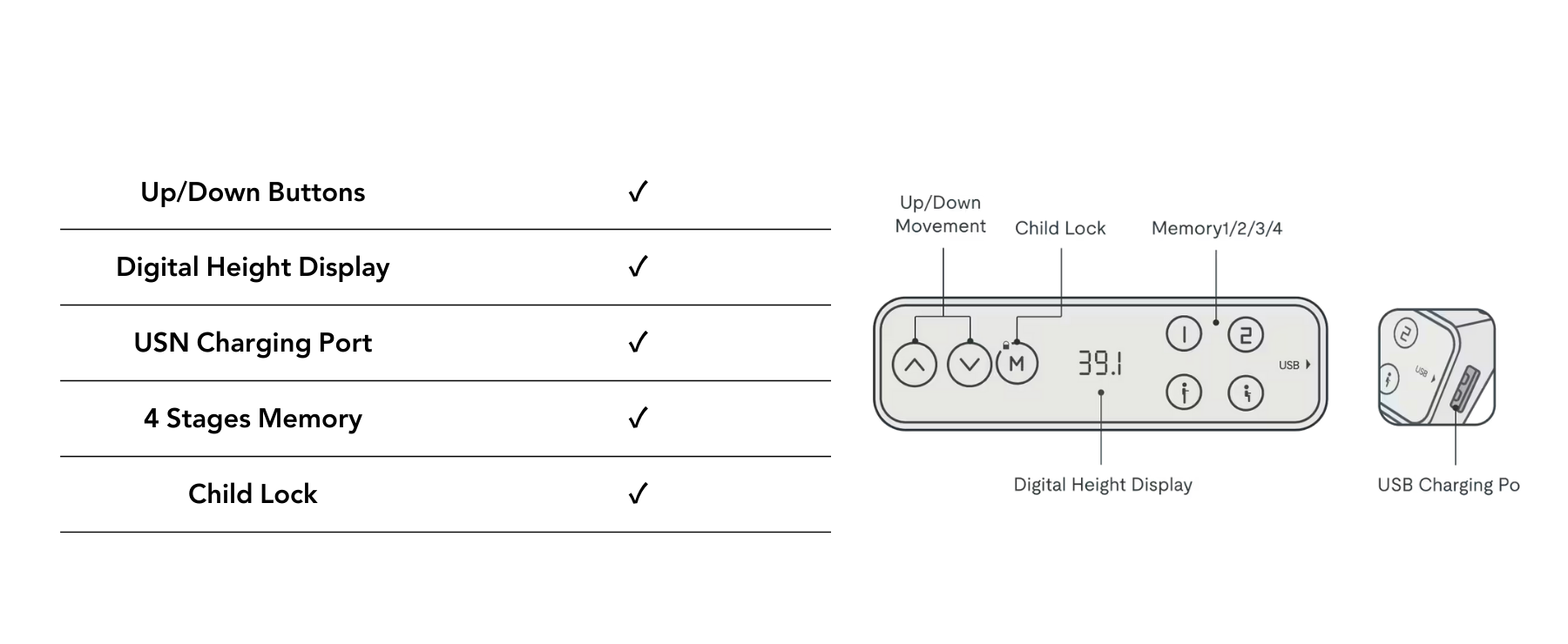 - Child Lock: With a single touch, you can lock the desk's position, ensuring children or pets don’t tamper with your workspace.